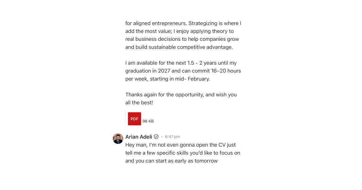My first hire happened because I accidentally answered an email while on vacation. A kid my age had reached out about a junior marketing position and I responded almost by reflex. We were supposed to meet and I stood him up because I couldn't figure out the schedule. I still feel terrible. I spent the rest of the day convinced I'd tell him I wasn't in a position to bring anyone on. We got on a call the day after and that's exactly what I said. He told me he wanted to work with us anyway, for free, despite having other paid offers on the table. He said what he saw in me was closer to the life he wanted to live than what he saw in his other interviews.